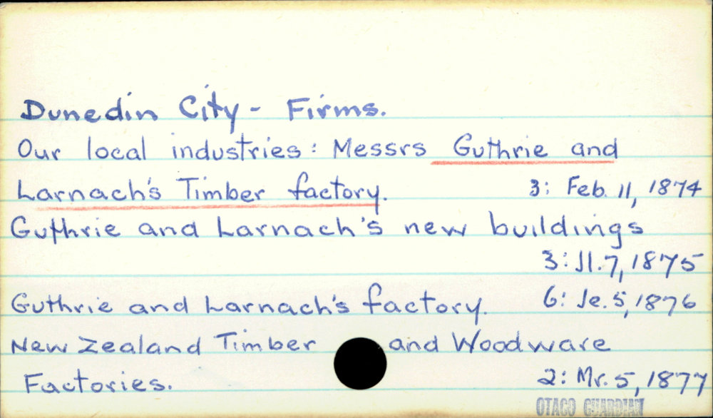 Dunedin Public Libraries (21st Jul 2016). Dunedin City - Firms - Guthrie and Larnach. In Website Dunedin Public Libraries. Retrieved 2nd Apr 2026 16:31, from https://dunedin.recollect.co.nz/nodes/view/47573