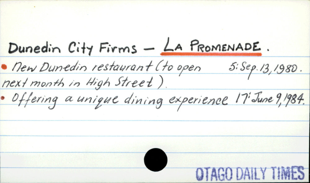 Dunedin Public Libraries (14th Jan 2017). Dunedin City - Firms - LA PROMENADE. In Website Dunedin Public Libraries. Retrieved 4th Apr 2026 14:58, from https://dunedin.recollect.co.nz/nodes/view/47938
