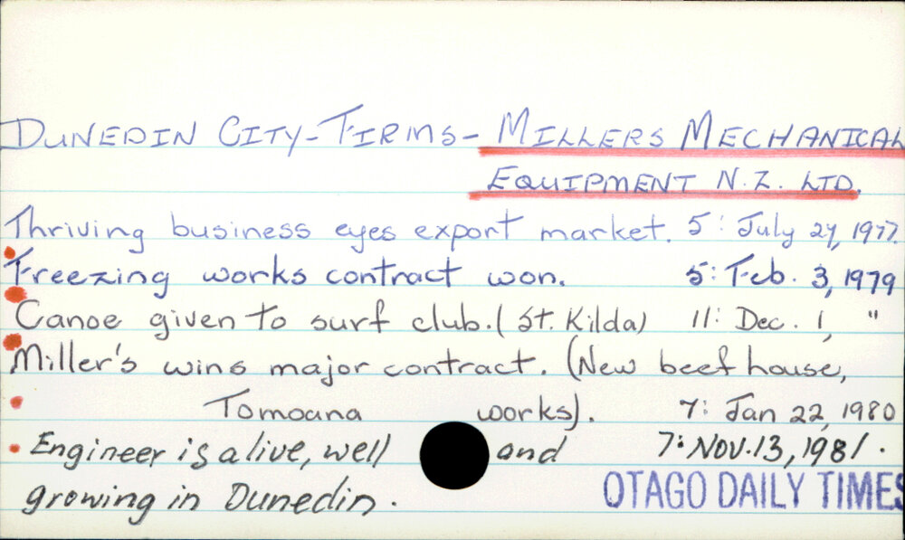 Dunedin Public Libraries (12th Jan 2017). Dunedin City - Firms - Millers Mechanical Equipment N.Z. Ltd.. In Website Dunedin Public Libraries. Retrieved 19th Apr 2026 23:54, from https://dunedin.recollect.co.nz/nodes/view/48138