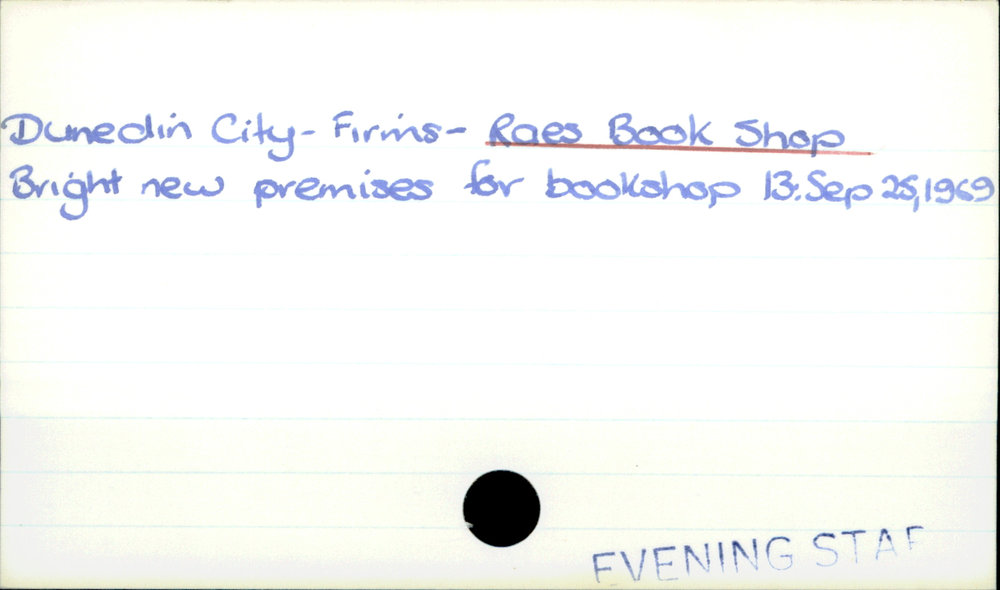 Dunedin Public Libraries (6th Jan 2017). Dunedin City - Firms - Rae's Book Shop. In Website Dunedin Public Libraries. Retrieved 2nd Apr 2026 14:11, from https://dunedin.recollect.co.nz/nodes/view/48567