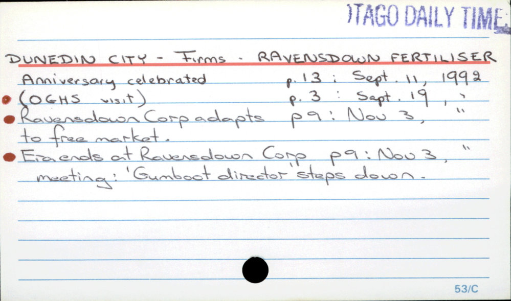 Dunedin Public Libraries (6th Jan 2017). Dunedin City - Firms - Ravensdown Fertiliser. In Website Dunedin Public Libraries. Retrieved 2nd Apr 2026 14:11, from https://dunedin.recollect.co.nz/nodes/view/48575