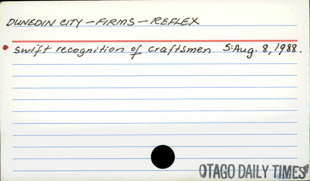 Dunedin Public Libraries (6th Jan 2017). Dunedin City - Firms - Reflex. In Website Dunedin Public Libraries. Retrieved 2nd Apr 2026 14:11, from https://dunedin.recollect.co.nz/nodes/view/48588