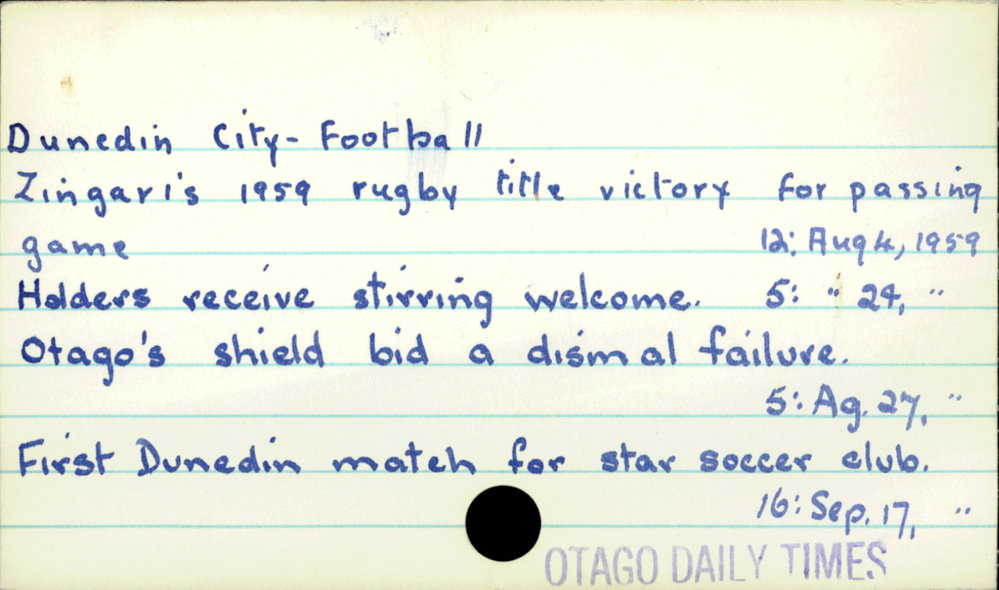 Dunedin Public Libraries (20th Jan 2017). Dunedin City - Football. In Website Dunedin Public Libraries. Retrieved 27th Mar 2026 15:11, from https://dunedin.recollect.co.nz/nodes/view/49585
