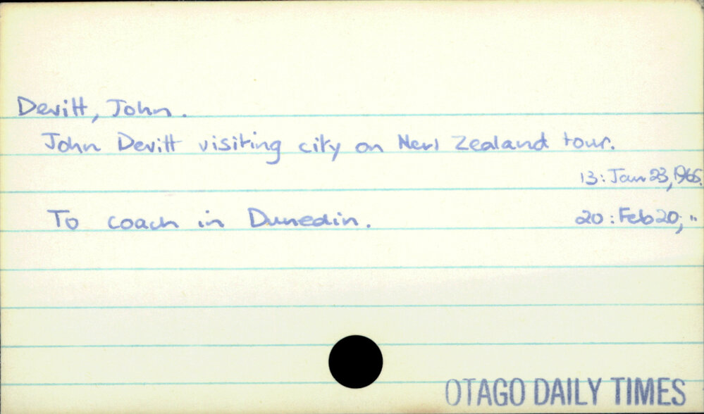 Dunedin Public Libraries (7th Aug 2019). Devitt, John. In Website Dunedin Public Libraries. Retrieved 4th Apr 2026 22:47, from https://dunedin.recollect.co.nz/nodes/view/50484