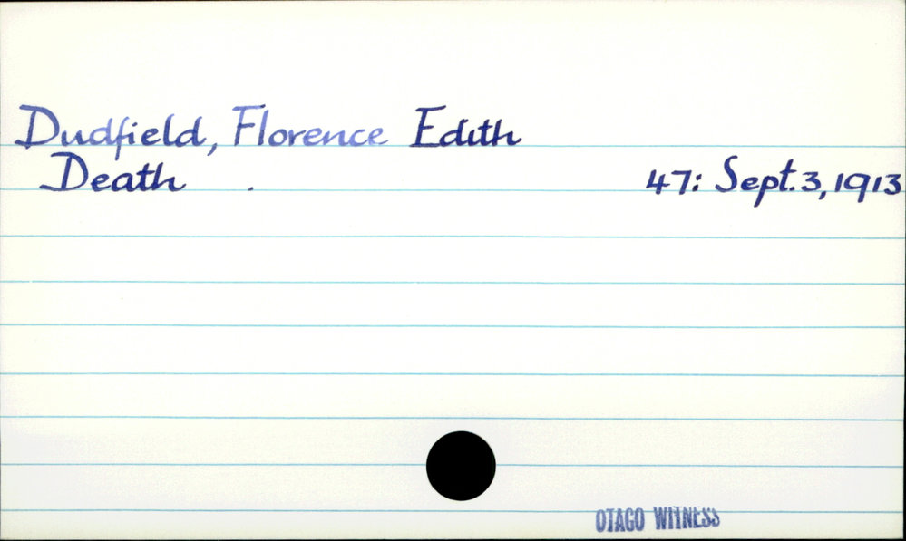 Dunedin Public Libraries (30th Aug 2019). Dudfield, Florence Edith. In Website Dunedin Public Libraries. Retrieved 5th Apr 2026 02:28, from https://dunedin.recollect.co.nz/nodes/view/53163