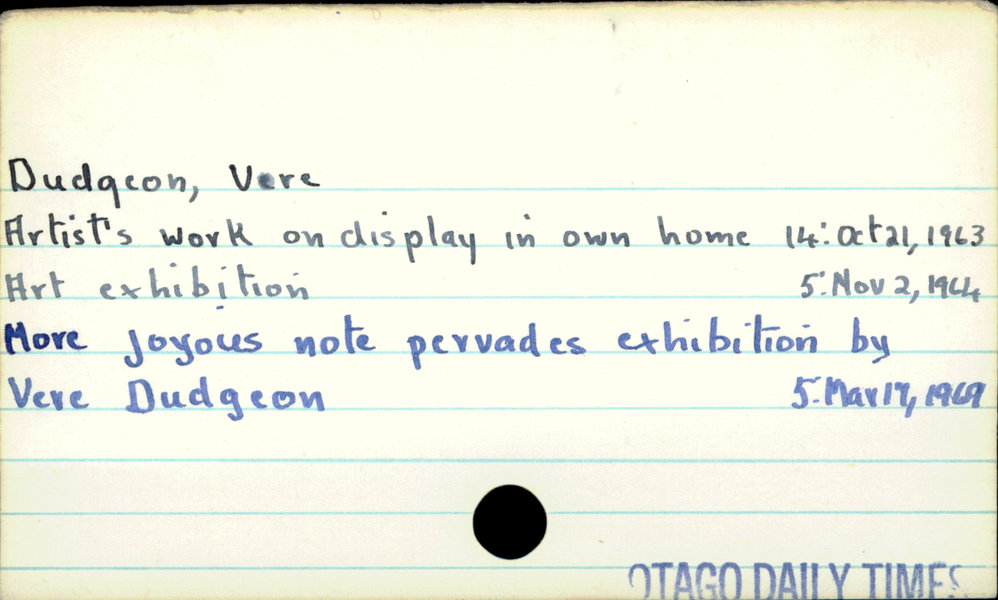 Dunedin Public Libraries (1st Sep 2019). Dudgeon, Vere. In Website Dunedin Public Libraries. Retrieved 5th Apr 2026 02:28, from https://dunedin.recollect.co.nz/nodes/view/53168