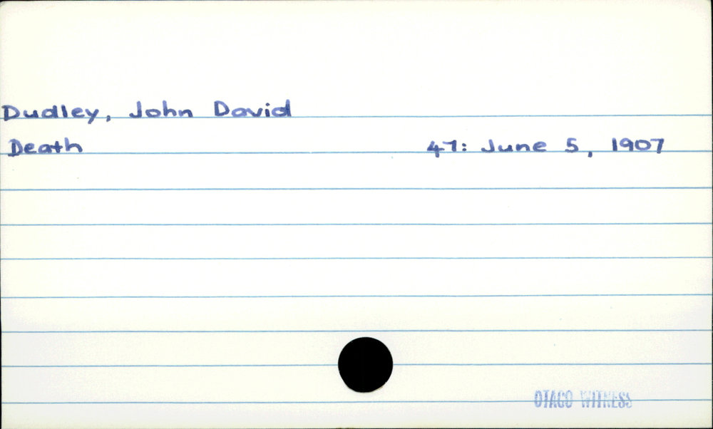 Dunedin Public Libraries (31st Aug 2019). Dudley, John David. In Website Dunedin Public Libraries. Retrieved 5th Apr 2026 02:38, from https://dunedin.recollect.co.nz/nodes/view/53174
