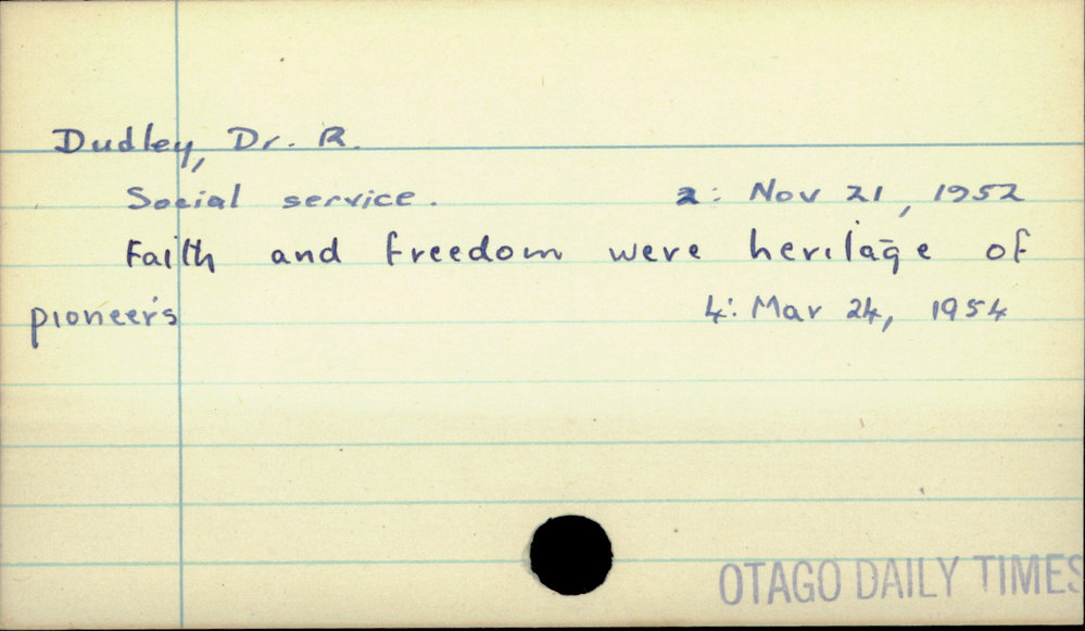 Dunedin Public Libraries (31st Aug 2019). Dudley, Dr. R.. In Website Dunedin Public Libraries. Retrieved 5th Apr 2026 02:28, from https://dunedin.recollect.co.nz/nodes/view/53177