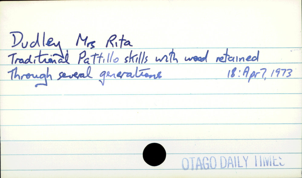 Dunedin Public Libraries (1st Sep 2019). Dudley Mrs Rita. In Website Dunedin Public Libraries. Retrieved 5th Apr 2026 02:38, from https://dunedin.recollect.co.nz/nodes/view/53183