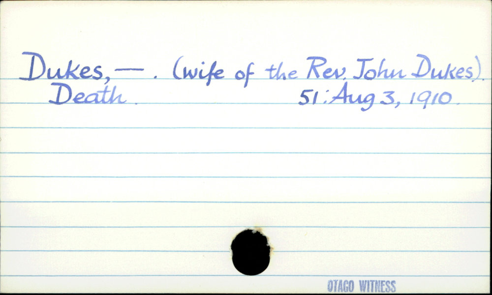 Dunedin Public Libraries (3rd May 2016). Dukes, -. (wife of the Rev. John Dukes).. In Website Dunedin Public Libraries. Retrieved 4th Apr 2026 01:32, from https://dunedin.recollect.co.nz/nodes/view/53377
