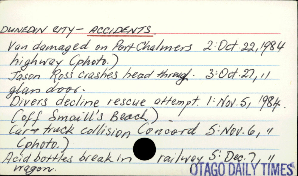 Dunedin Public Libraries (7th Jun 2016). Dunedin City - Accidents. In Website Dunedin Public Libraries. Retrieved 2nd Apr 2026 14:22, from https://dunedin.recollect.co.nz/nodes/view/54110