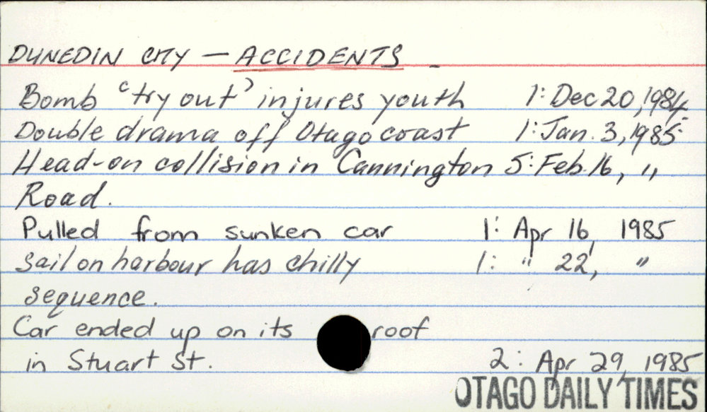 Dunedin Public Libraries (3rd Jun 2016). Dunedin City - Accidents. In Website Dunedin Public Libraries. Retrieved 2nd Apr 2026 14:16, from https://dunedin.recollect.co.nz/nodes/view/54111
