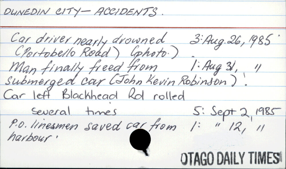 Dunedin Public Libraries (3rd Jun 2016). Dunedin City - Accidents. In Website Dunedin Public Libraries. Retrieved 2nd Apr 2026 14:14, from https://dunedin.recollect.co.nz/nodes/view/54118