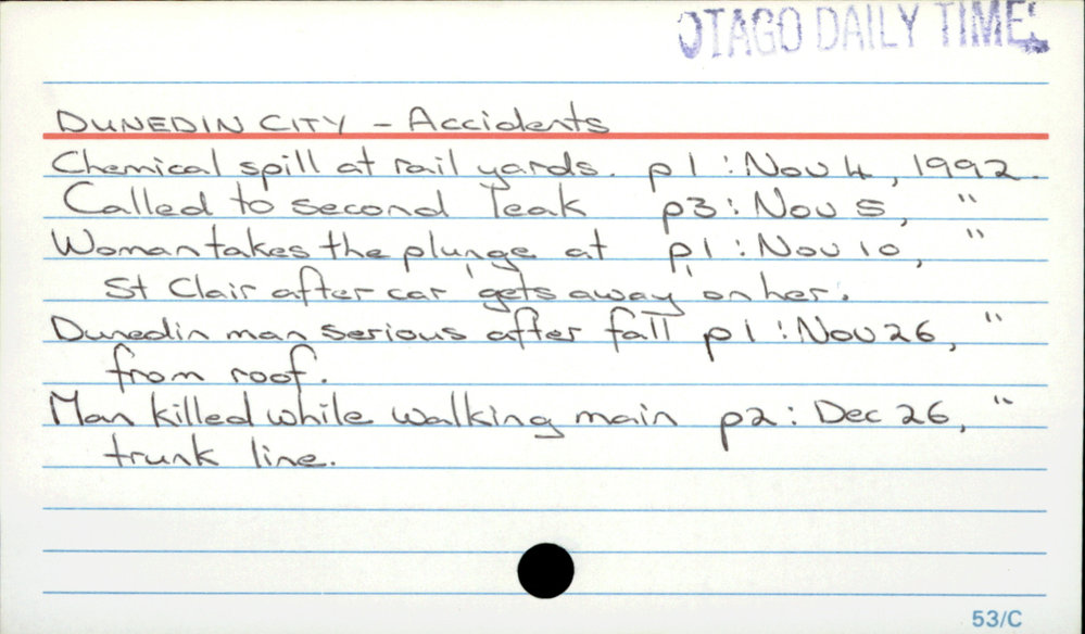 Dunedin Public Libraries (3rd Jun 2016). Dunedin CIty - Accidents. In Website Dunedin Public Libraries. Retrieved 2nd Apr 2026 14:16, from https://dunedin.recollect.co.nz/nodes/view/54126