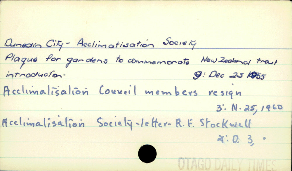 Dunedin Public Libraries (2nd Jun 2016). Dunedin City - Acclimatisation Society. In Website Dunedin Public Libraries. Retrieved 2nd Apr 2026 14:10, from https://dunedin.recollect.co.nz/nodes/view/54128