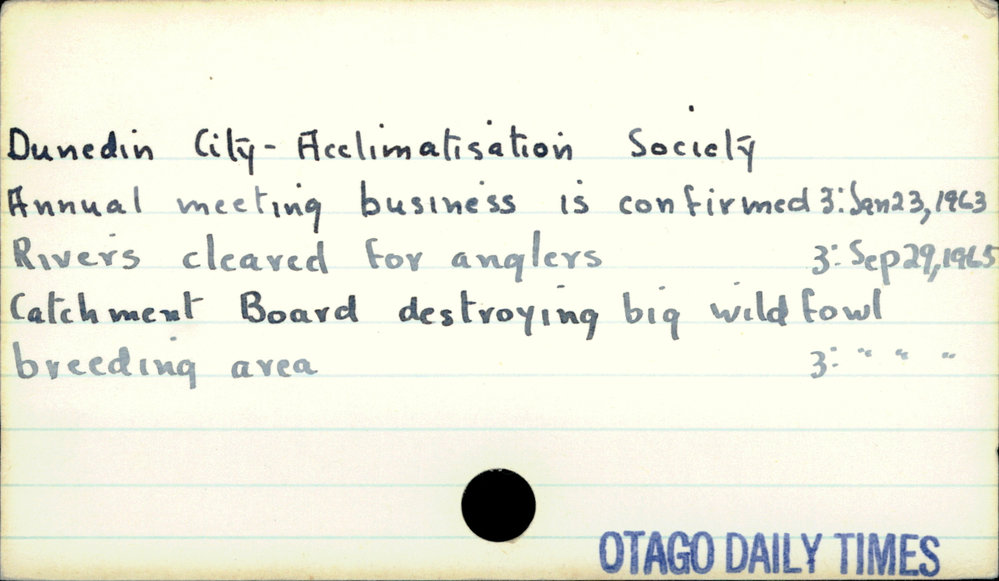 Dunedin Public Libraries (3rd Jun 2016). Dunedin City - Acclimatisation Society. In Website Dunedin Public Libraries. Retrieved 2nd Apr 2026 14:22, from https://dunedin.recollect.co.nz/nodes/view/54130