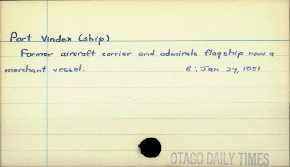 Dunedin Public Libraries (6th Jan 2022). Port Vindex (ship). In Website Dunedin Public Libraries. Retrieved 3rd Apr 2026 18:55, from https://dunedin.recollect.co.nz/nodes/view/55786