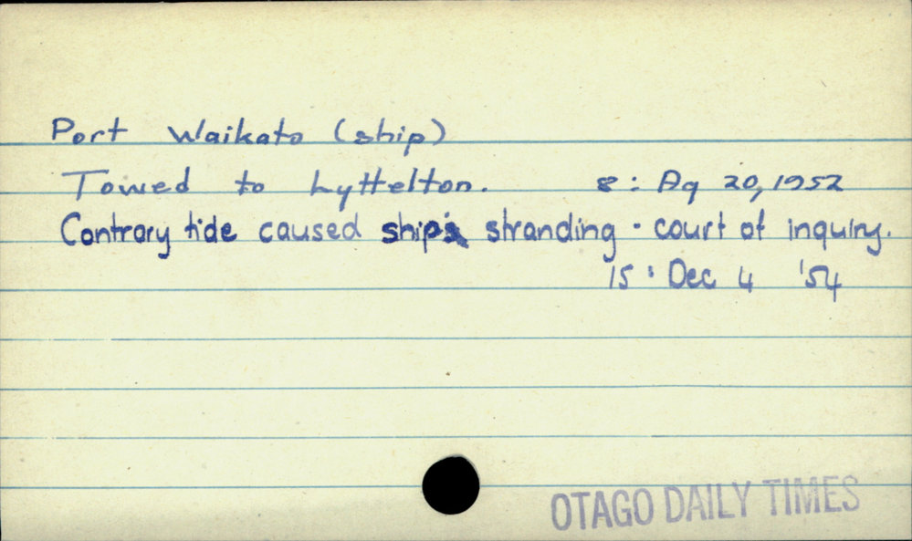 Dunedin Public Libraries (13th Jan 2022). Port Waikato (ship). In Website Dunedin Public Libraries. Retrieved 3rd Apr 2026 18:56, from https://dunedin.recollect.co.nz/nodes/view/55790