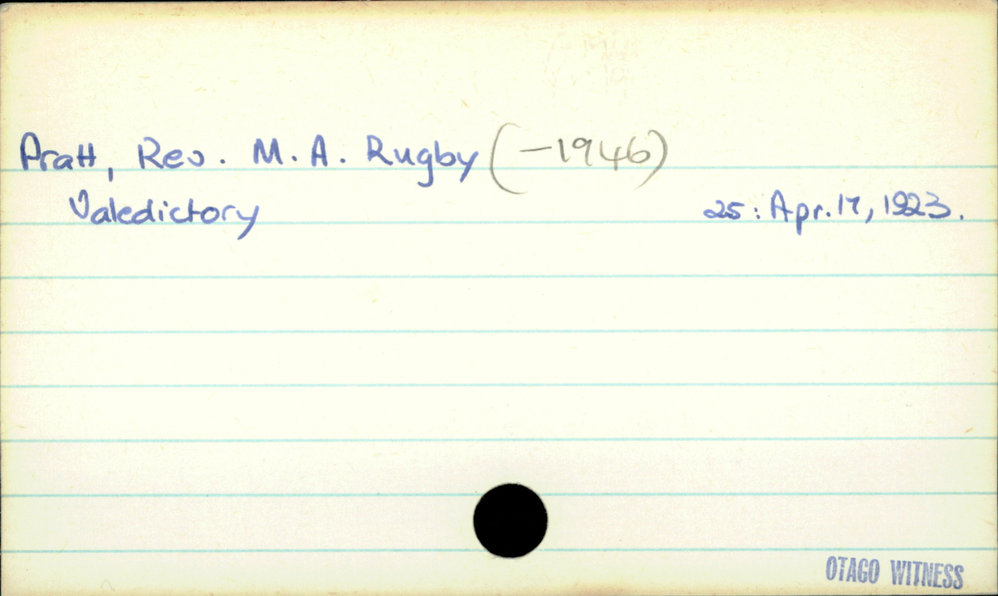 Dunedin Public Libraries (16th Jan 2022). Pratt, Rev. M.A. Rugby (-1946). In Website Dunedin Public Libraries. Retrieved 4th Apr 2026 07:34, from https://dunedin.recollect.co.nz/nodes/view/56698