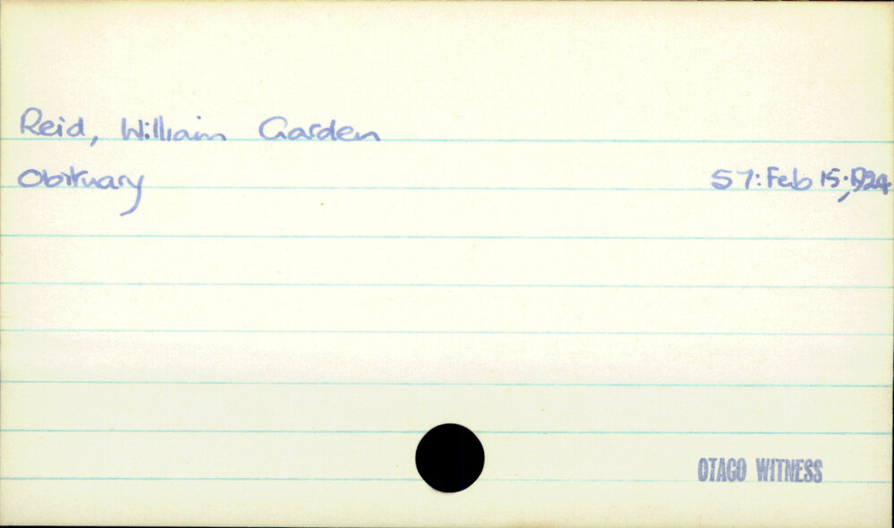 Dunedin Public Libraries (11th Apr 2022). Reid, William Garden. In Website Dunedin Public Libraries. Retrieved 22nd Apr 2026 06:01, from https://dunedin.recollect.co.nz/nodes/view/62311