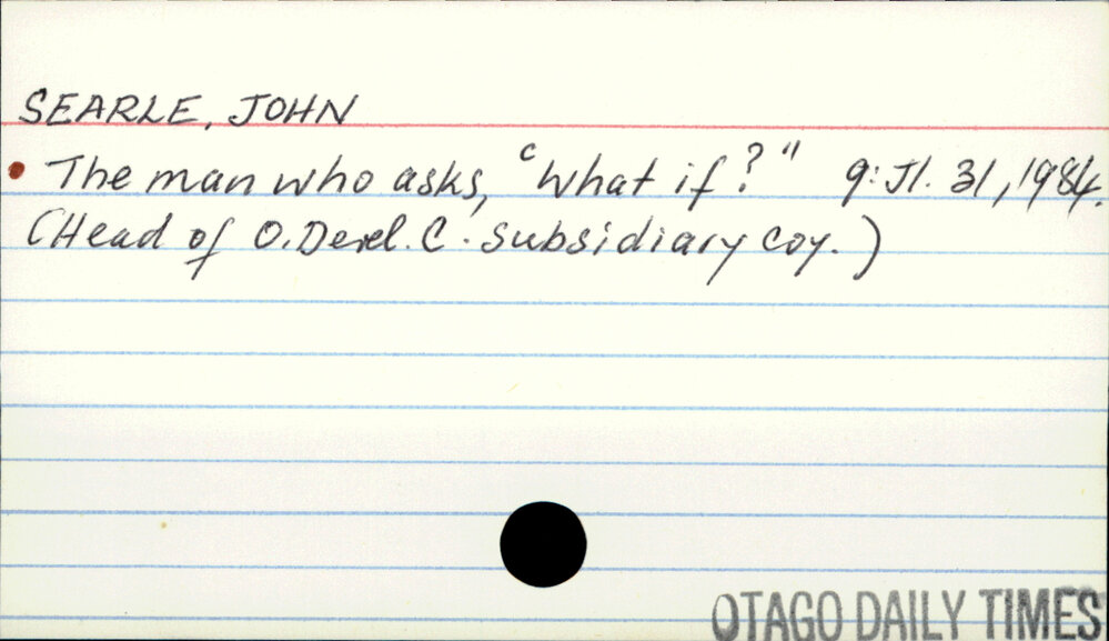 Dunedin Public Libraries (18th Jul 2022). Searle, John. In Website Dunedin Public Libraries. Retrieved 6th Apr 2026 03:11, from https://dunedin.recollect.co.nz/nodes/view/70900