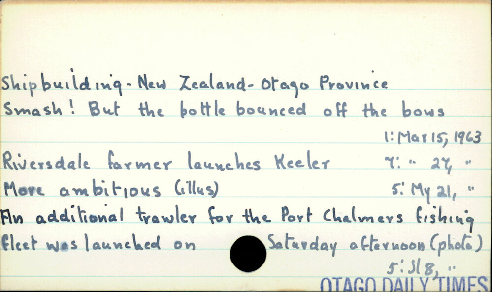 Dunedin Public Libraries (10th Aug 2022). Shipbuilding - New Zealand - Otago Province . In Website Dunedin Public Libraries. Retrieved 4th Apr 2026 10:50, from https://dunedin.recollect.co.nz/nodes/view/72578