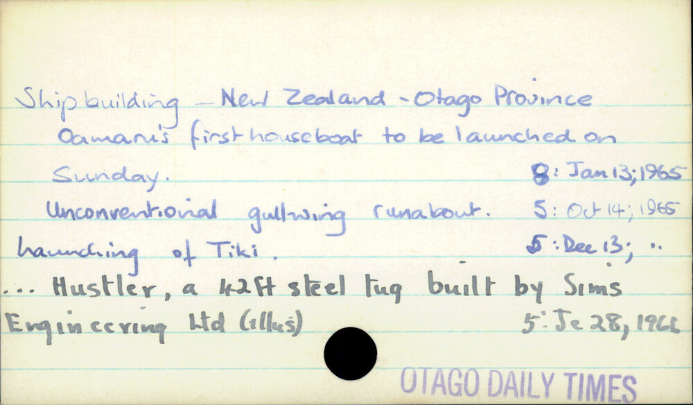 Dunedin Public Libraries (10th Aug 2022). Shipbuilding - New Zealand - Otago Province. In Website Dunedin Public Libraries. Retrieved 4th Apr 2026 10:50, from https://dunedin.recollect.co.nz/nodes/view/72583
