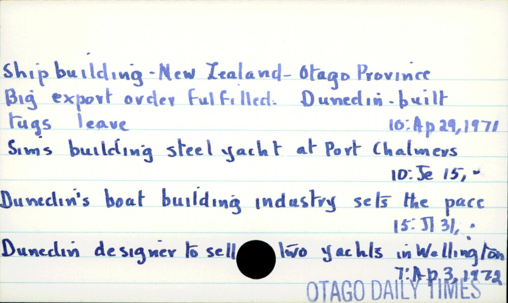 Dunedin Public Libraries (10th Aug 2022). Shipbuilding - New Zealand - Otago Province . In Website Dunedin Public Libraries. Retrieved 4th Apr 2026 10:50, from https://dunedin.recollect.co.nz/nodes/view/72589