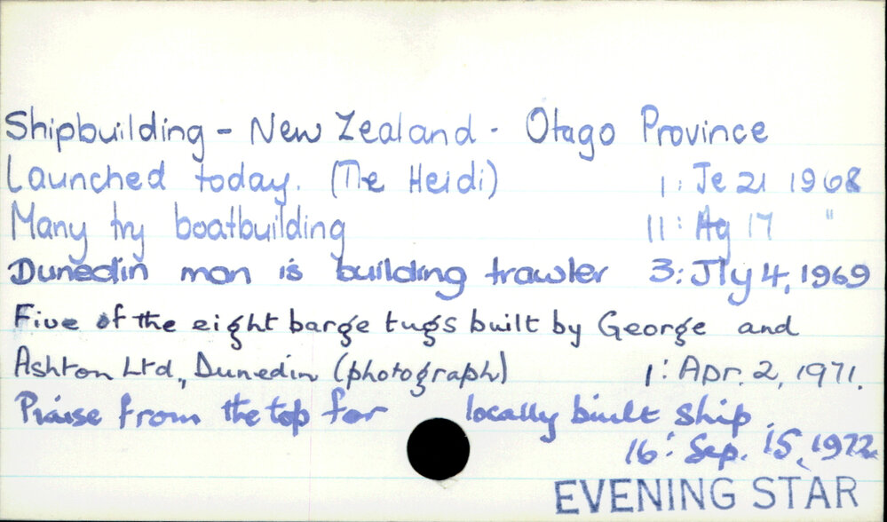 Dunedin Public Libraries (19th Sep 2022). Shipbuilding - New Zealand - Otago Province . In Website Dunedin Public Libraries. Retrieved 4th Apr 2026 10:50, from https://dunedin.recollect.co.nz/nodes/view/72593