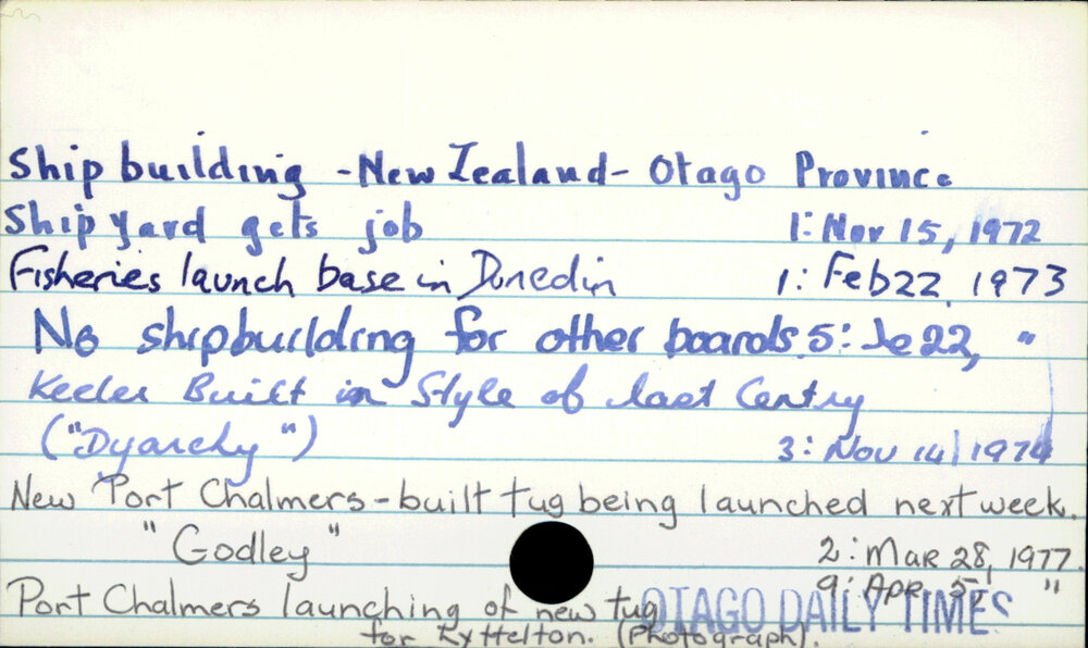 Dunedin Public Libraries (7th Aug 2022). Shipbuilding - New Zealand - Otago Province. In Website Dunedin Public Libraries. Retrieved 4th Apr 2026 10:50, from https://dunedin.recollect.co.nz/nodes/view/72595