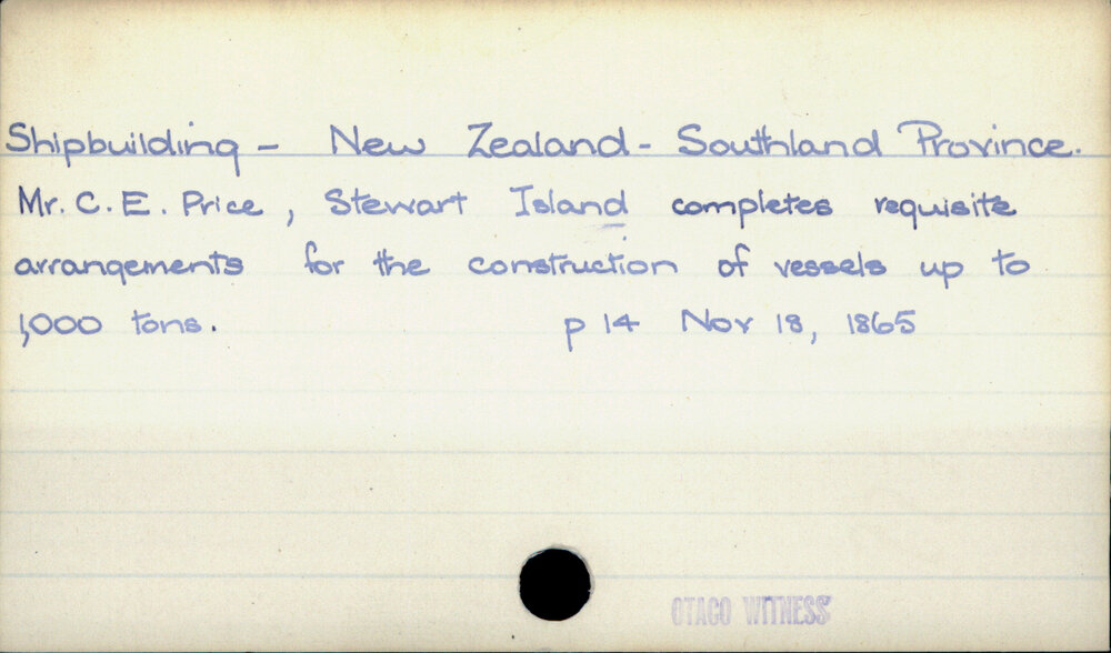 Dunedin Public Libraries (19th Sep 2022). Shipbuilding - New Zealand - Southland Province. In Website Dunedin Public Libraries. Retrieved 4th Apr 2026 10:50, from https://dunedin.recollect.co.nz/nodes/view/72599