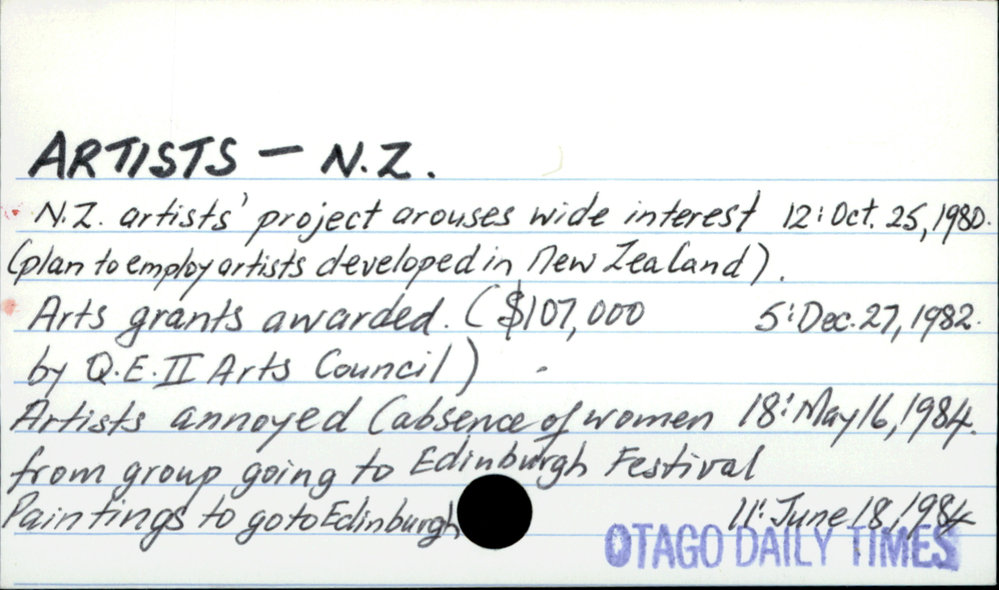 Dunedin Public Libraries (16th Sep 2018). Artists - New Zealand. In Website Dunedin Public Libraries. Retrieved 27th Mar 2026 14:15, from https://dunedin.recollect.co.nz/nodes/view/7378