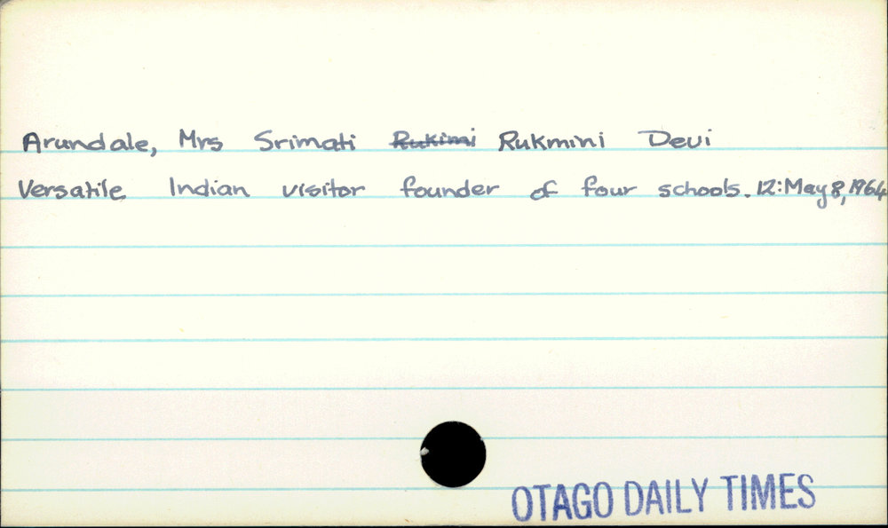 Dunedin Public Libraries (3rd Sep 2018). Arundale, Mrs Srimati Rukmini Devi. In Website Dunedin Public Libraries. Retrieved 27th Mar 2026 14:15, from https://dunedin.recollect.co.nz/nodes/view/7384