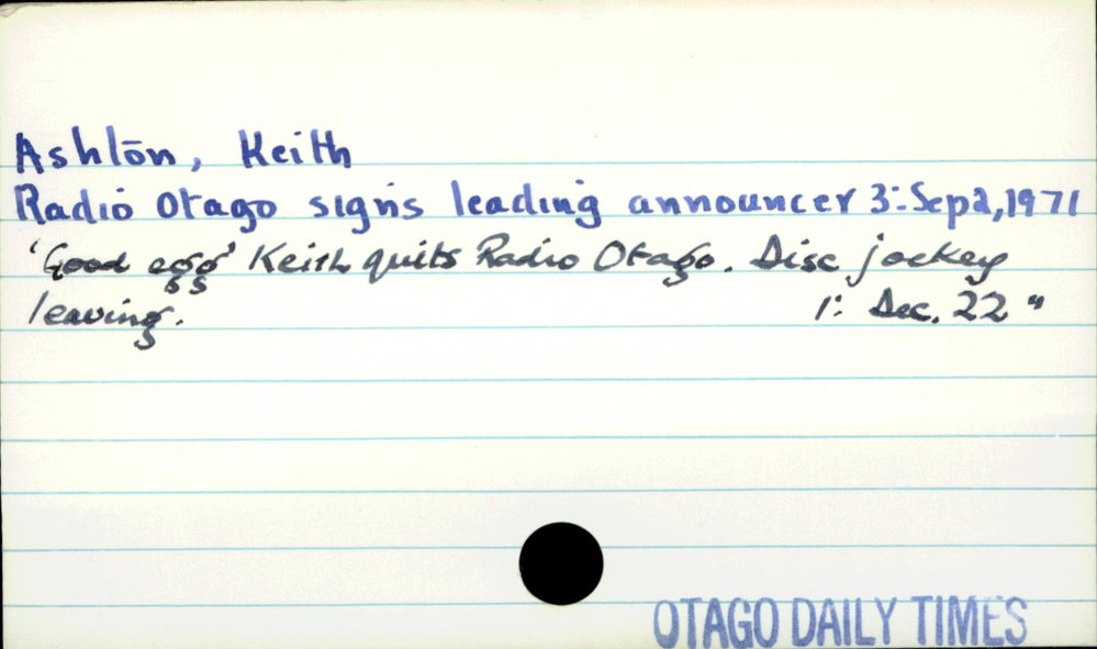 Dunedin Public Libraries (8th Oct 2018). Ashton, Keith. In Website Dunedin Public Libraries. Retrieved 12th Apr 2026 00:18, from https://dunedin.recollect.co.nz/nodes/view/7492