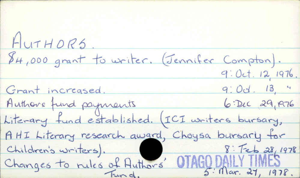 Dunedin Public Libraries (25th Sep 2018). AUTHORS . In Website Dunedin Public Libraries. Retrieved 2nd Apr 2026 17:56, from https://dunedin.recollect.co.nz/nodes/view/8376