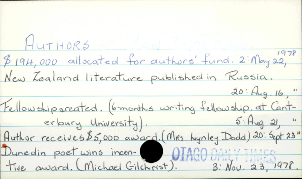 Dunedin Public Libraries (25th Sep 2018). AUTHORS . In Website Dunedin Public Libraries. Retrieved 2nd Apr 2026 17:45, from https://dunedin.recollect.co.nz/nodes/view/8379