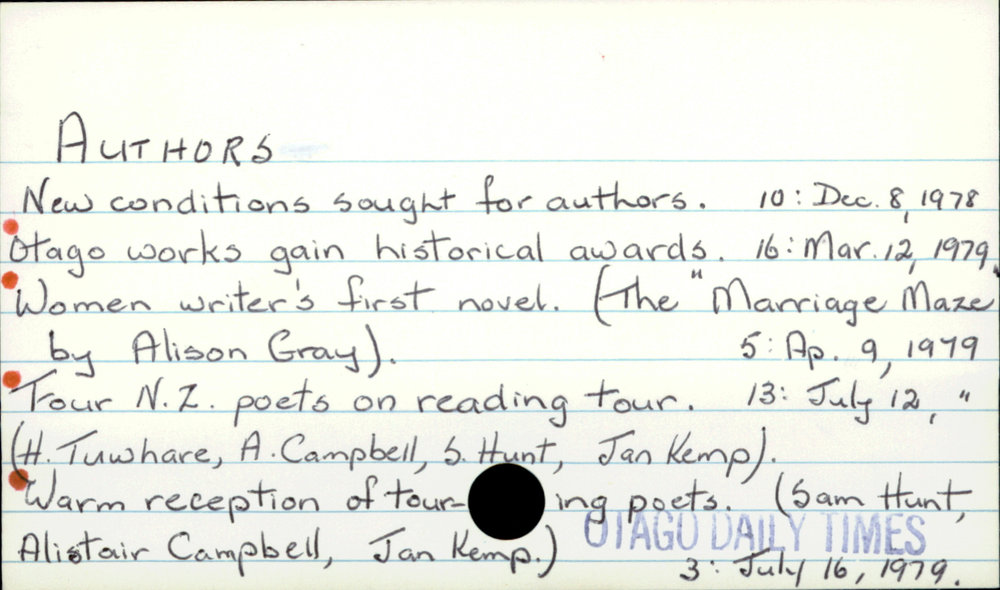 Dunedin Public Libraries (25th Sep 2018). AUTHORS . In Website Dunedin Public Libraries. Retrieved 2nd Apr 2026 17:45, from https://dunedin.recollect.co.nz/nodes/view/8382