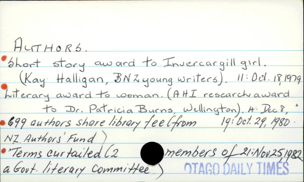Dunedin Public Libraries (25th Sep 2018). AUTHORS . In Website Dunedin Public Libraries. Retrieved 2nd Apr 2026 17:45, from https://dunedin.recollect.co.nz/nodes/view/8383