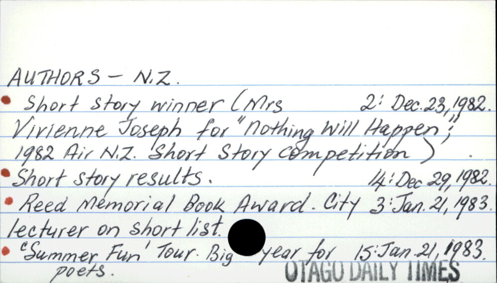 Dunedin Public Libraries (25th Sep 2018). AUTHORS - N. Z. . In Website Dunedin Public Libraries. Retrieved 2nd Apr 2026 17:45, from https://dunedin.recollect.co.nz/nodes/view/8386