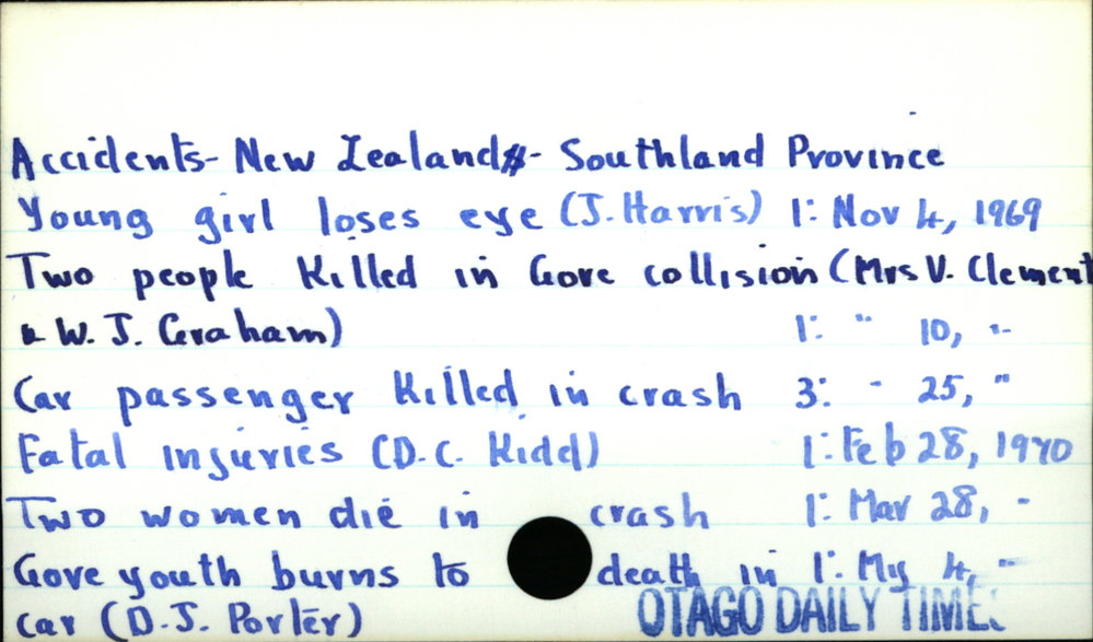 Dunedin Public Libraries (18th May 2018). Accidents - New Zealand - Southland Province. In Website Dunedin Public Libraries. Retrieved 5th Apr 2026 08:57, from https://dunedin.recollect.co.nz/nodes/view/868
