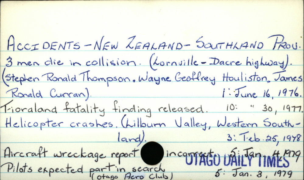 Dunedin Public Libraries (19th May 2018). Accidents - New Zealand - Southland Province. In Website Dunedin Public Libraries. Retrieved 4th Apr 2026 09:18, from https://dunedin.recollect.co.nz/nodes/view/874