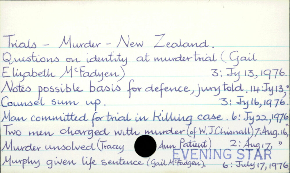 Dunedin Public Libraries (22nd Mar 2023). Trials - Murder - New Zealand. In Website Dunedin Public Libraries. Retrieved 4th Apr 2026 22:23, from https://dunedin.recollect.co.nz/nodes/view/89152