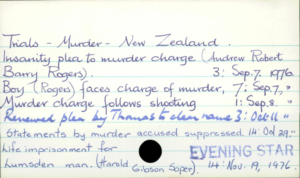 Dunedin Public Libraries (22nd Mar 2023). Trials - Murder - New Zealand. In Website Dunedin Public Libraries. Retrieved 4th Apr 2026 22:23, from https://dunedin.recollect.co.nz/nodes/view/89154