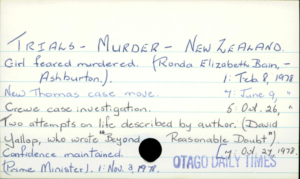 Dunedin Public Libraries (22nd Mar 2023). Trails - Murder - New Zaland. In Website Dunedin Public Libraries. Retrieved 4th Apr 2026 22:23, from https://dunedin.recollect.co.nz/nodes/view/89158