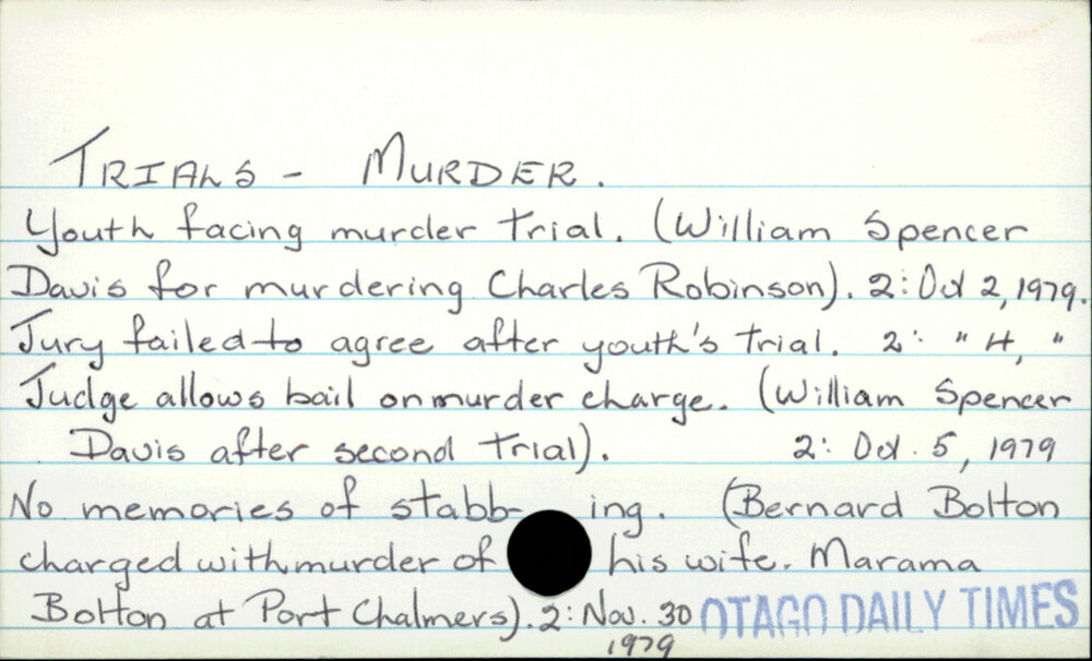 Dunedin Public Libraries (23rd Apr 2023). TRIALS - MURDER . In Website Dunedin Public Libraries. Retrieved 4th Apr 2026 22:23, from https://dunedin.recollect.co.nz/nodes/view/89161