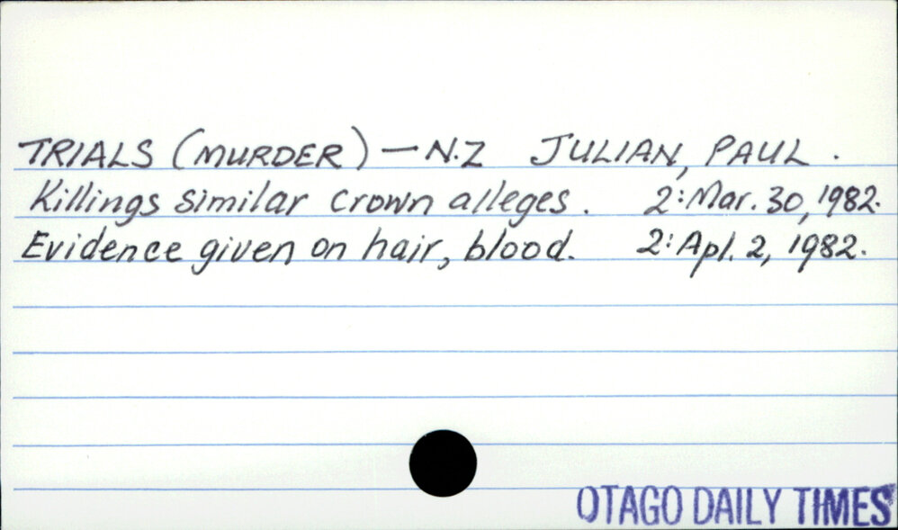 Dunedin Public Libraries (22nd Mar 2023). Trials (Murder) - New Zealand - Paul Julian. In Website Dunedin Public Libraries. Retrieved 5th Apr 2026 00:18, from https://dunedin.recollect.co.nz/nodes/view/89165