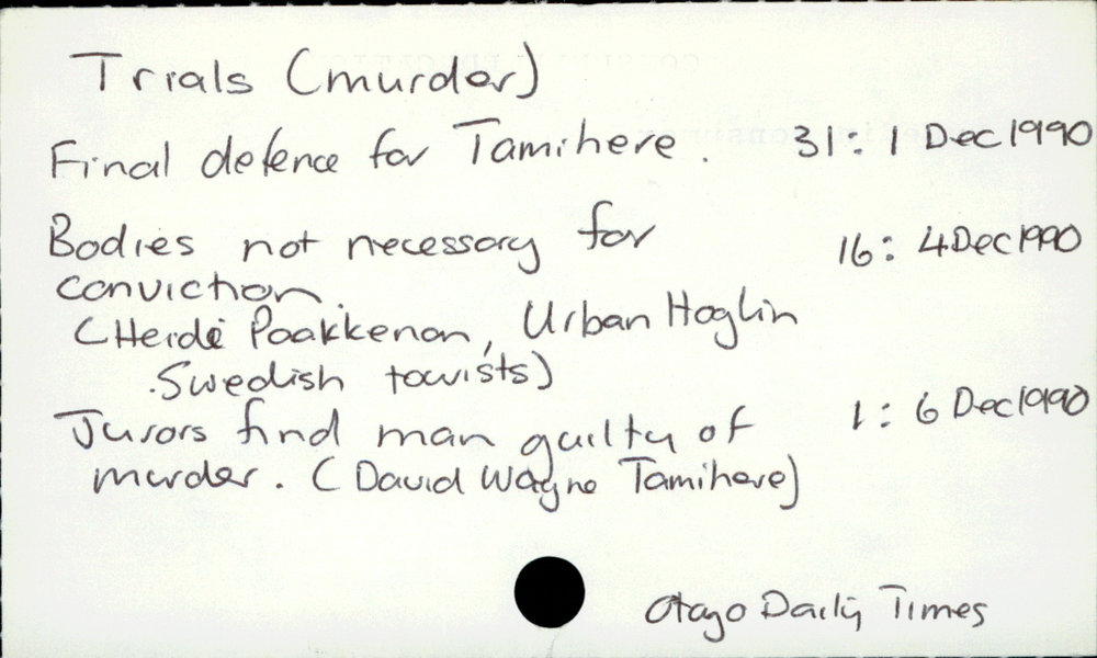 Dunedin Public Libraries (22nd Mar 2023). Trials (Murder) - New Zealand. In Website Dunedin Public Libraries. Retrieved 5th Apr 2026 00:18, from https://dunedin.recollect.co.nz/nodes/view/89168