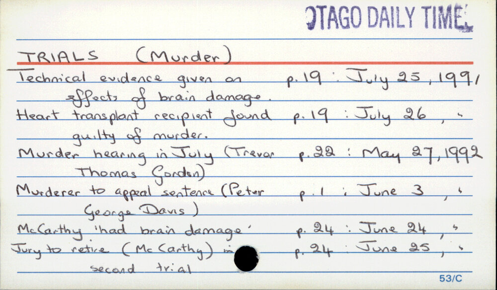 Dunedin Public Libraries (22nd Mar 2023). Trials (Murder) - New Zealand. In Website Dunedin Public Libraries. Retrieved 5th Apr 2026 00:18, from https://dunedin.recollect.co.nz/nodes/view/89169