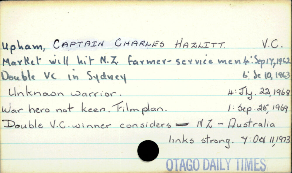 Dunedin Public Libraries (5th Apr 2023). Upham, Captain Charles Hazlitt, V.C.. In Website Dunedin Public Libraries. Retrieved 24th Apr 2026 03:19, from https://dunedin.recollect.co.nz/nodes/view/90895