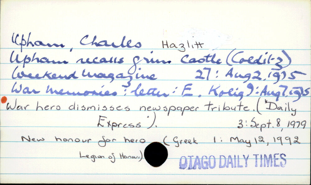 Dunedin Public Libraries (28th Apr 2023). Upham, Charles Hazlitt. In Website Dunedin Public Libraries. Retrieved 24th Apr 2026 03:18, from https://dunedin.recollect.co.nz/nodes/view/90896